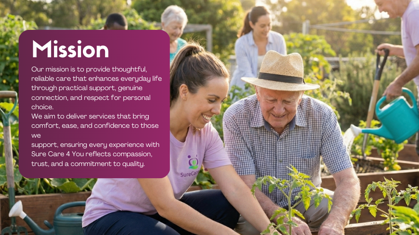 Welcome to SURECARE 4 You PTY LTD; where care is guided by understanding, respect, and genuine connection. We provide reliable NDIS support that fits naturally into your lifestyle, helping you live with comfort and confidence. From daily routines to community involvement, our team ensures every moment of care is delivered with warmth, consistency, and trust.